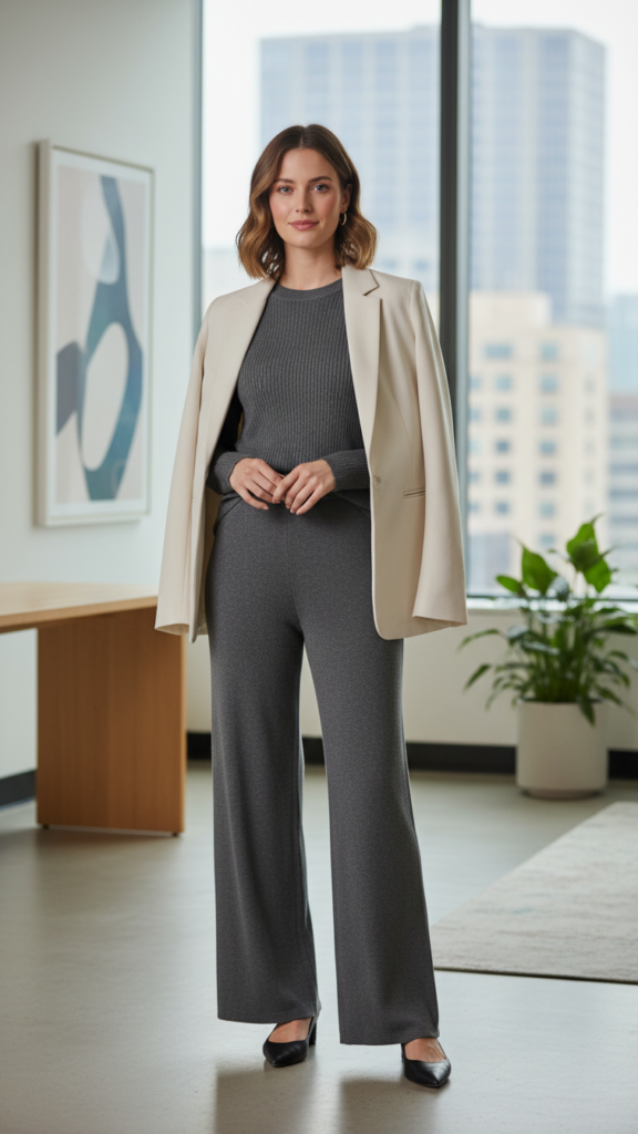 Modern knit sets revolutionize office dressing by providing the comfort of loungewear with the polished appearance of traditional suiting. You’ll find that matching knit tops and bottoms create instant sophistication while allowing unrestricted movement throughout your workday. Choose sets in neutral tones like charcoal, navy, or camel for maximum versatility.