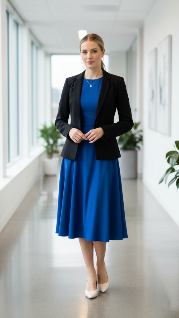 Building on the comfort-focused approach of coordinated knits, A-line dresses paired with structured outerwear offer you a feminine yet authoritative office look that commands respect.