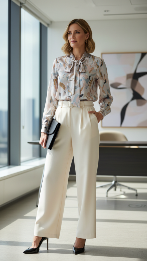 Why settle for ordinary office attire when high-waisted trousers paired with silk blouses create an instantly sophisticated ensemble that boosts your professional presence? This combination offers you the freedom to move confidently while maintaining executive-level polish.