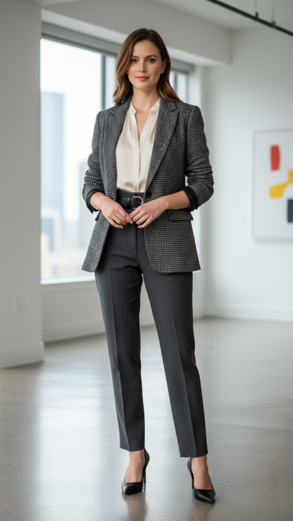 Pair with well-fitted trousers in complementary colors – navy blazer with charcoal pants, or matching sets for maximum impact. The key to mastering tailored pants for workwear is ensuring they fit properly at the waist and have a clean line through the leg. This combination lets you command respect while feeling comfortable and unrestricted.