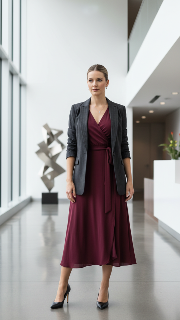 Layer cozy knit cardigans or structured blazers over your wrap dress for temperature control and added professionalism. Complete your look with refined accessories such as a structured leather handbag, classic pumps, and minimal jewelry that enhances without overwhelming your silhouette. These chic office outfits create the foundation for a polished and professional appearance that commands respect. This combination creates executive presence while allowing freedom of movement.