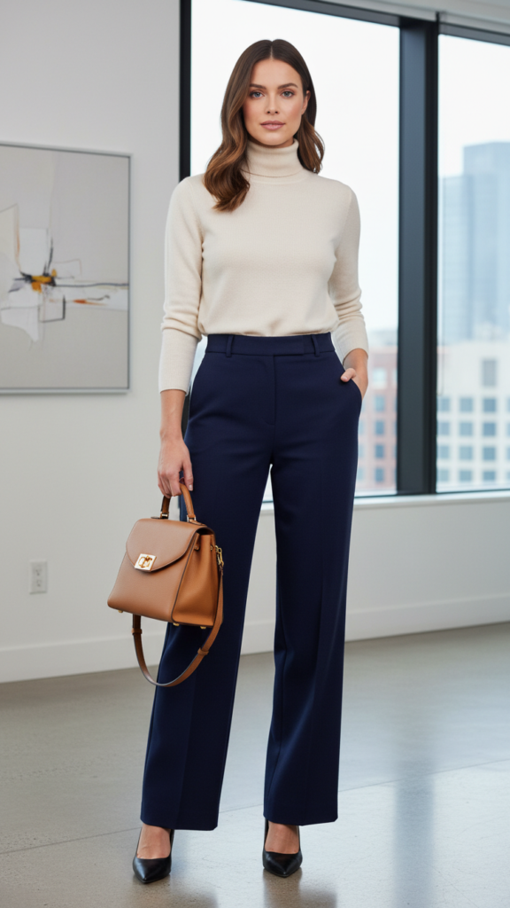 When you combine a sleek turtleneck with wide-leg trousers, you’re creating one of the most sophisticated and commanding looks in professional fashion. This outfit breaks free from traditional blazer requirements while maintaining executive presence.