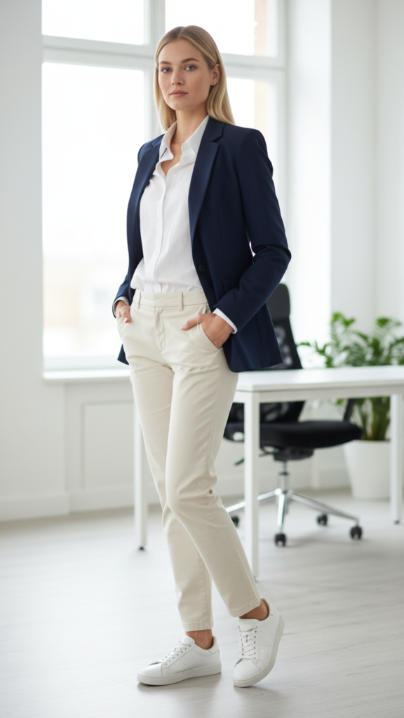 When you’re building a sophisticated yet comfortable office look, classic white sneakers paired with a customized blazer and chinos create the perfect foundation. This combination delivers casual chic appeal while maintaining workplace appropriateness.