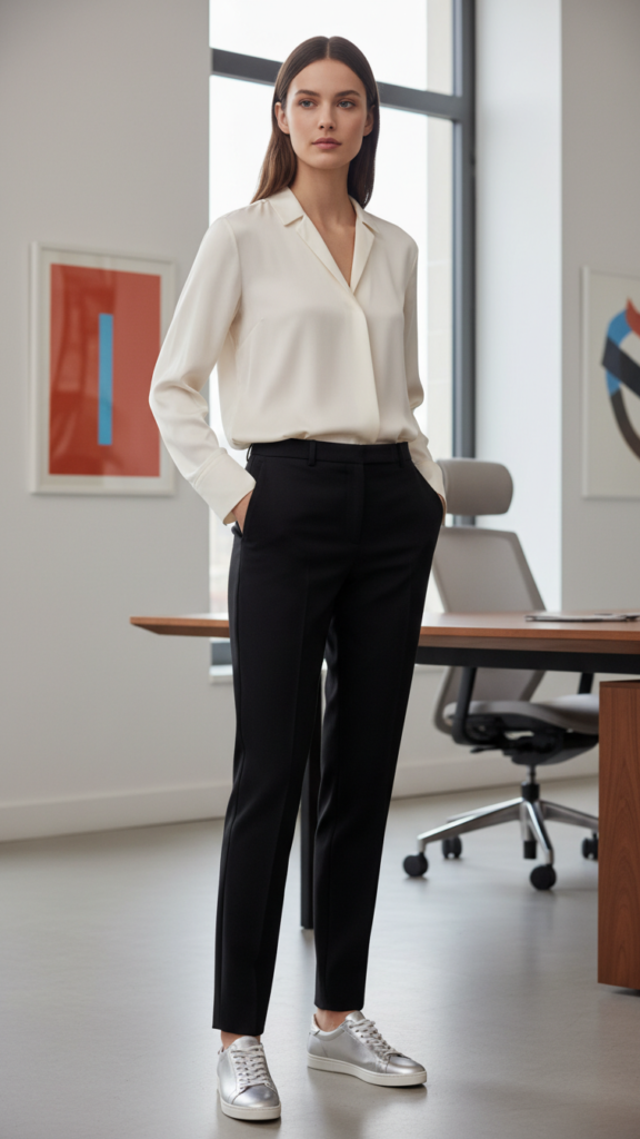 Pair these pieces with a silk blouse in soft colors—ivory, blush, or sage green work beautifully. Tuck the blouse loosely for a relaxed yet polished appearance that’ll keep you confident during meetings.