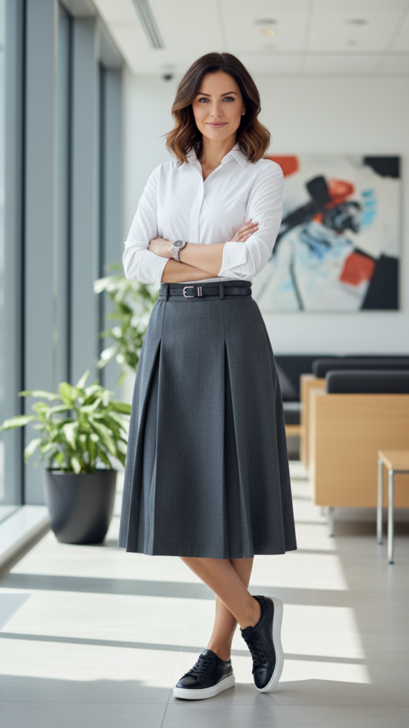 The leather texture contrast between your sneakers and fabric creates visual depth that commands attention. Choose a structured midi skirt in wool or cotton blend, paired with a crisp white or soft blue button-down shirt.