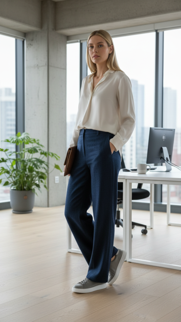 Choose wide-leg trousers in neutral tones like navy, charcoal, or cream to complement your gray sneakers perfectly. The flowing fabric creates elevated silhouettes that elongate your frame while maintaining comfort throughout busy workdays. For additional inspiration on incorporating wide-leg jeans into your professional wardrobe, consider how the relaxed fit maintains the same elegant proportions as tailored trousers.