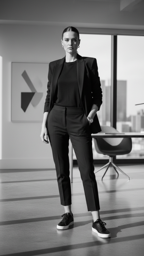 Choose black or white sneakers to anchor your minimalist silhouette with cropped trousers that hit just above the ankle. This strategic proportion creates clean lines that elongate your frame while maintaining workplace appropriateness.