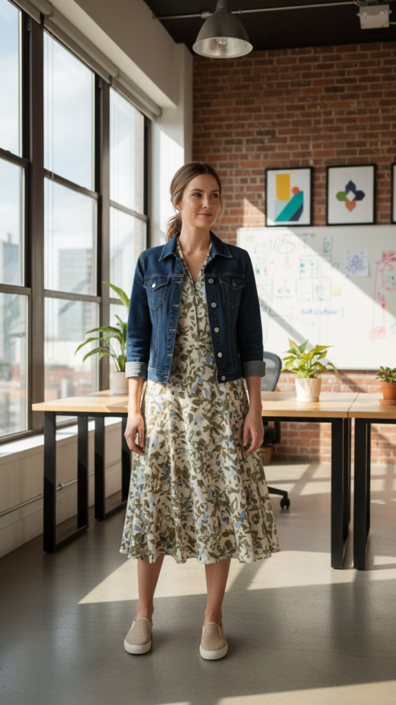 Add a tailored denim jacket to soften formal elements while maintaining workplace appropriateness. Alternative slip on styles like leather or canvas options provide different aesthetic approaches for various office environments. These dressy slip on sneaker pairings work exceptionally well for creative workspaces or casual Fridays.