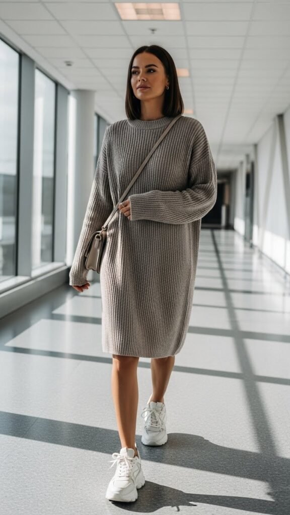 Choose a ribbed knit or cable-knit sweater dress in a neutral shade, and style it with white or black chunky sneakers. You can add biker shorts or leggings underneath if you want extra coverage and warmth. Throw on some knee-high socks for a cute touch, or keep it simple with no-show socks. A small shoulder bag or backpack completes the look. The dress is comfortable enough to curl up and nap in, but you’ll still look stylish walking through the airport. Plus, when you arrive at your destination, just swap the sneakers for boots and you’ve got a whole new outfit vibe.