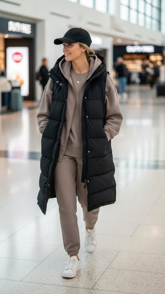 Puffer vests are having a serious moment, and the longline version paired with cozy loungewear is perfect for airport style. The vest adds that trendy, sporty element while keeping your arms free to wrestle with your carry-on or grab your coffee.