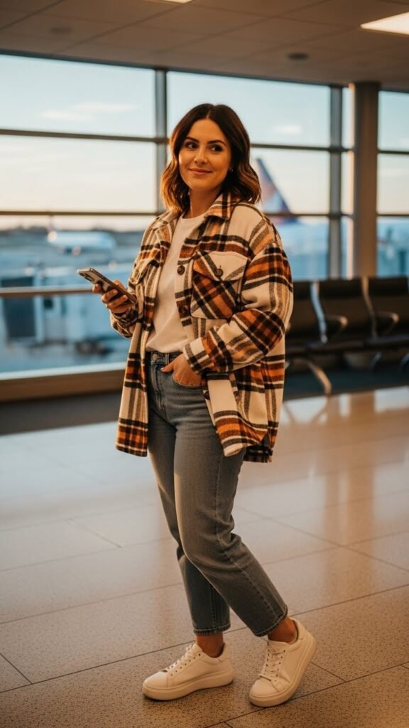 Go for a flannel or corduroy shacket in fall colors like burgundy, forest green, or classic plaid. Pair with straight-leg or mom jeans and a simple white tee or bodysuit underneath. Ankle boots or platform sneakers work great here. The shacket has this cool, outdoorsy vibe that makes you look like you’re about to go on some Instagram-worthy adventure. Plus, the pockets are clutch for storing all your random travel essentials. You can button it up for warmth or leave it open for a more relaxed look. Super versatile and endlessly stylish.
