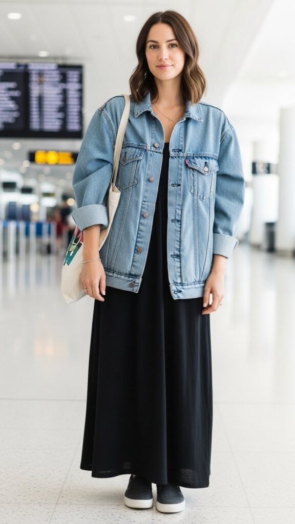 For those transitional weather days when you need options, an oversized denim jacket layered over a flowy maxi dress is absolute perfection. The dress keeps you feeling feminine and breezy, while the denim jacket adds structure and warmth when the airport AC is absolutely brutal.