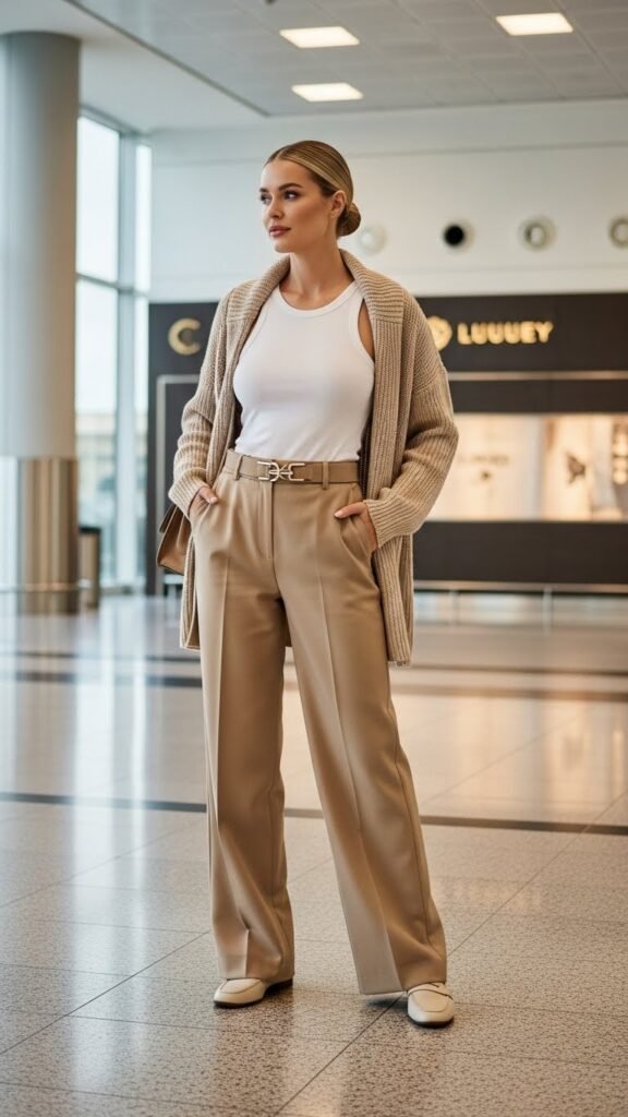 Choose flowy trousers in linen or a soft knit fabric in neutral tones like beige, black, or navy. The fitted tank balances out the volume of the pants and shows that yes, you do have a figure under all that fabric. Layer with an oversized cardigan or denim jacket for warmth, and finish with loafers or minimal sneakers. Throw your hair in a slick bun, add some statement earrings, and suddenly you’re that chic airport person everyone lowkey wants to be. The trousers move with you, never feel restrictive, and look polished from takeoff to landing.