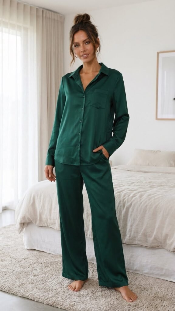 Nothing screams “I have my life together” quite like a matching silk or satin pajama set. Even if your life is actually chaos, this outfit says otherwise. The coordinated top and bottom combo in a rich jewel tone or classic navy instantly elevates you from “rolling out of bed” to “casually glamorous.” Stick with a relaxed fit because the whole point is looking polished without trying too hard. A messy bun and delicate gold jewelry complete this look perfectly. Your friends will think you walked straight out of a luxury hotel commercial.