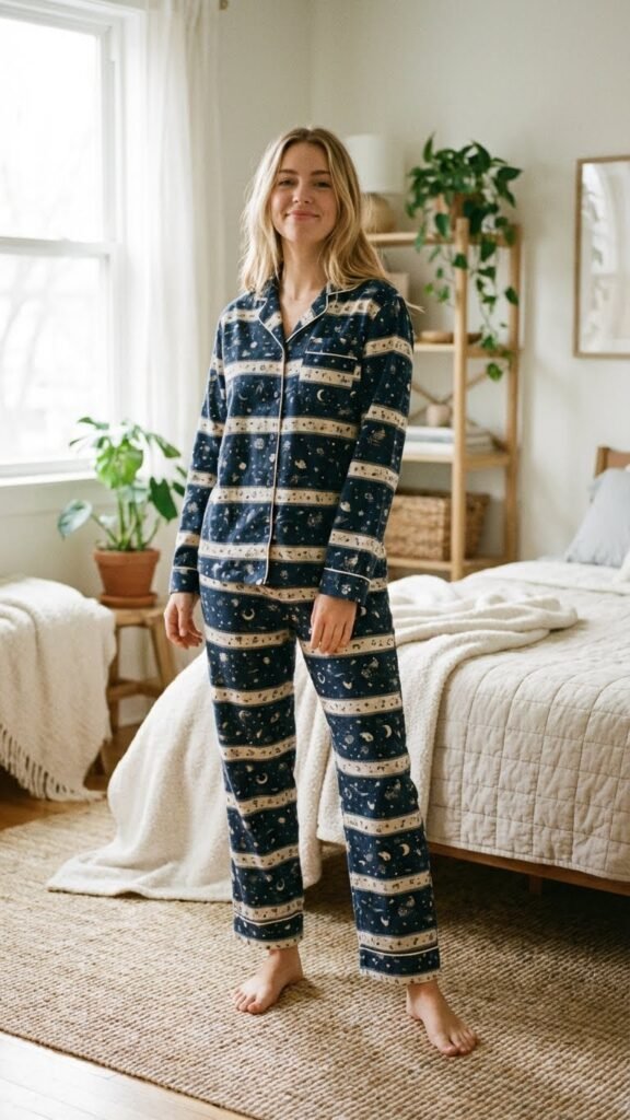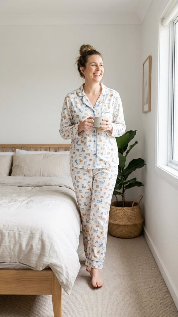 Why be subtle when you can let your personality shine through your pajamas? Printed matching sets in fun patterns like lemons, stars, florals, or even pizza slices show off your playful side. The trick to pulling this off is keeping everything else simple. No excessive accessories, no complicated hair styling. Let the print do the talking. These sets are perfect conversation starters and photograph like a dream. Just make sure the print actually makes you happy because you’ll be seeing a lot of it in the group photos.