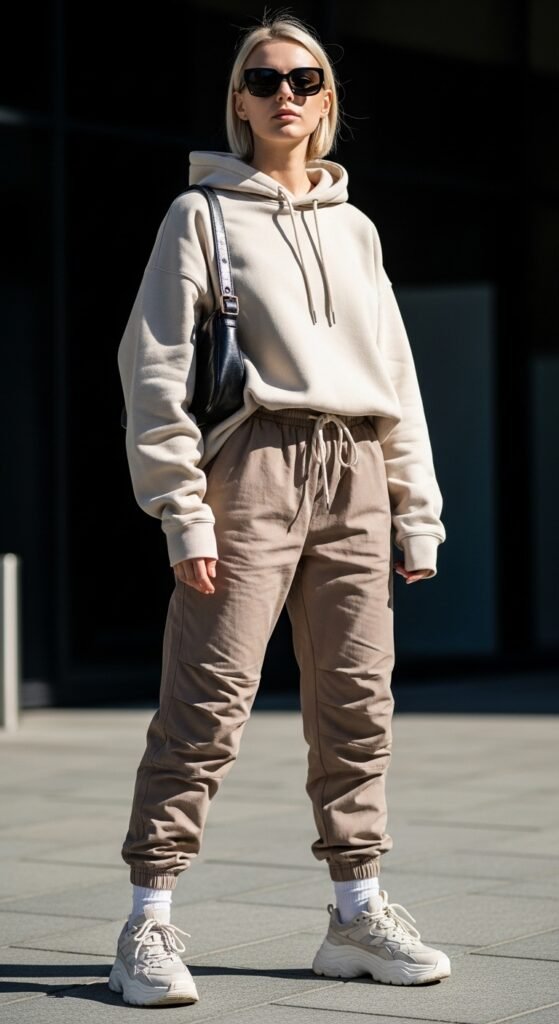 Let’s start with the ultimate no-brainer combo. Throw on an oversized hoodie with your parachute trousers and you’ve instantly got that “I woke up like this but also look really cool” energy. The bagginess of both pieces creates this relaxed silhouette that’s pure streetwear gold. Go for a neutral hoodie if you want to keep things minimal, or pick something with a bold graphic if you’re feeling spicy. Then add chunky sneakers to ground the look. I’m talking those thick-soled dad shoes that make every outfit instantly trendier. The best part? You can literally wear this to grab coffee, meet friends, or binge-watch your favorite show. Comfort level: chef’s kiss.
