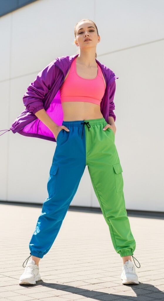 Athleisure meets streetwear in this sporty combo. Pair a sports bra with parachute trousers and throw on a windbreaker for that cool-girl athletic vibe. This look is perfect for post-workout hangouts or days when you want to feel comfy but still look intentional. The windbreaker adds color and dimension, especially if you go for something with color-blocking or a fun pattern. Keep your sneakers clean and simple, maybe white or matching your windbreaker. This outfit proves that you don’t need to sacrifice style for comfort. Plus, it’s super functional if you’re actually hitting the gym or going for a walk. Fashion and fitness? We stan.