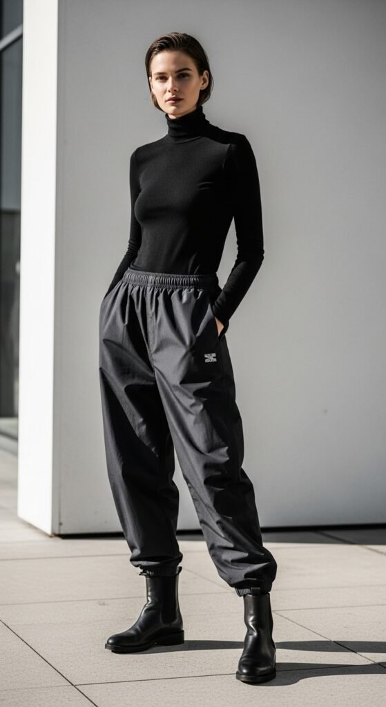 When the temperature drops, this is the outfit to reach for. A fitted turtleneck tucked into parachute trousers with Chelsea boots creates this sleek, streamlined look that’s perfect for colder months. The turtleneck adds warmth and sophistication, while the Chelsea boots bring that cool, slightly edgy vibe. I love this combo in monochrome, like all black or all beige, but you can definitely play with color too. Add a long coat or trench over top and you’ve got an outfit that looks straight out of a street style blog. This is autumn/winter dressing at its finest, and it requires basically zero effort.