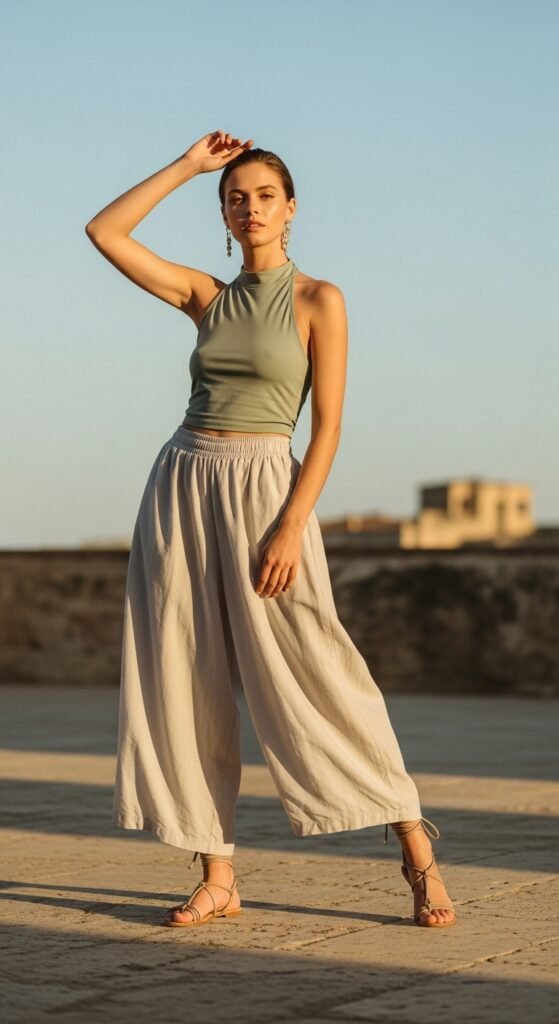 Summer nights call for this flirty combo. A halter top paired with parachute trousers and strappy sandals is giving vacation vibes in the best way. The halter shows off your shoulders and creates this elegant neckline, while the flowy pants keep things breezy and comfortable. This outfit works for beach dinners, rooftop parties, or really any warm-weather event. Go for a silky or satin halter in a bold color or fun print to make it feel extra special. The strappy sandals add a feminine touch that balances out the more utilitarian vibe of the parachute pants. This is how you do summer elegance without overheating.