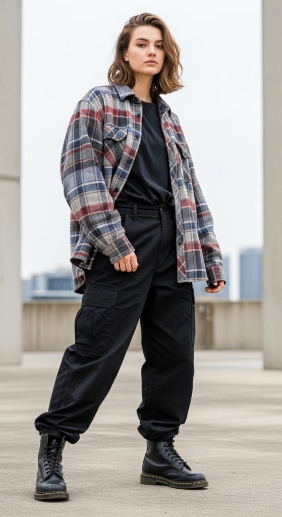 Grunge is back, baby, and this outfit is proof. An oversized flannel worn open over a tank top, paired with parachute trousers and Doc Martens, creates this perfect 90s-inspired look. The flannel adds layers and texture, the pants keep things modern, and the Docs bring that rebellious edge. I love wearing this outfit with messy hair and minimal makeup for that “I don’t care but I also look amazing” vibe. You can tie the flannel around your waist if you get warm, or wear it buttoned up with the sleeves rolled. This look is versatile, comfortable, and seriously cool. Plus, you probably already have most of these pieces in your closet.