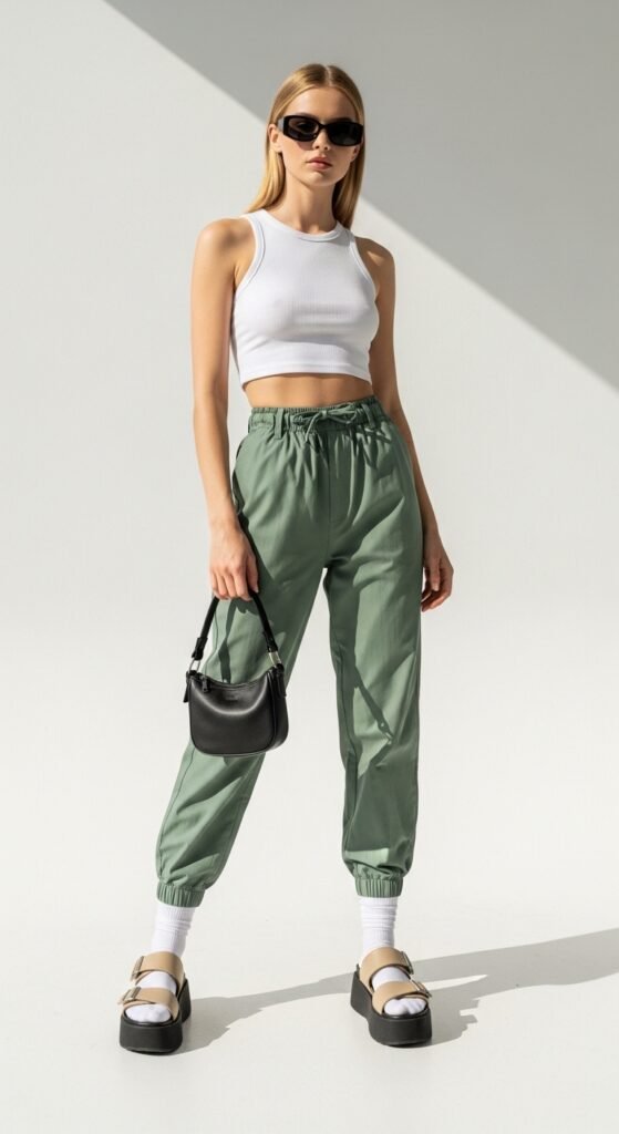 Want to show off those parachute pants in all their glory? Pair them with a cropped tank top and let those high-waisted trousers shine. This look is perfect for warmer days when you want to keep things breezy but still look put-together. The crop shows just enough skin to balance out the volume of the pants, and platform sandals add a little height without sacrificing comfort. Pro tip: go for a ribbed tank in a neutral shade like white, black, or tan. It keeps the focus on your pants while still looking polished. And honestly, is there anything better than an outfit that looks this good but feels like pajamas? I think not.