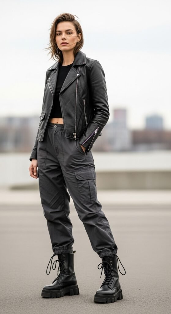 If you want to channel serious edgy vibes, this is your outfit. A classic leather jacket paired with parachute trousers creates this perfect contrast between tough and laid-back. The structured leather balances out the flowy pants, and combat boots complete the whole rebellious aesthetic. I love this combo for nights out or anytime you want to look like you’re about to drop the coolest album of the year. Throw on some silver jewelry, maybe a chain necklace or chunky rings, and you’re golden. This look screams confidence without trying too hard, which is basically the holy grail of streetwear.