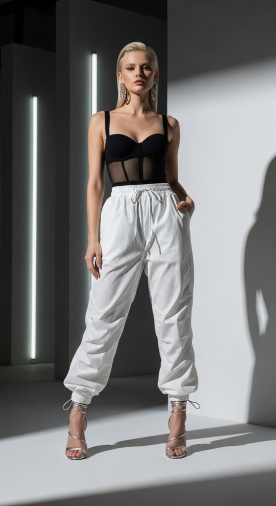Okay, hear me out on this one. Parachute trousers can absolutely be dressed up, and pairing them with a fitted bodysuit and strappy heels is proof. The bodysuit creates a sleek, streamlined top half that contrasts beautifully with the volume of the pants. Add strappy heels and suddenly you’ve got an outfit that works for date night, a fancy dinner, or literally any event where you want to look chic but different. Go for a black or jewel-toned bodysuit for maximum impact. This look shows that parachute pants aren’t just for casual days, they’re versatile enough to take you anywhere. And honestly, who doesn’t want pants that can do both?