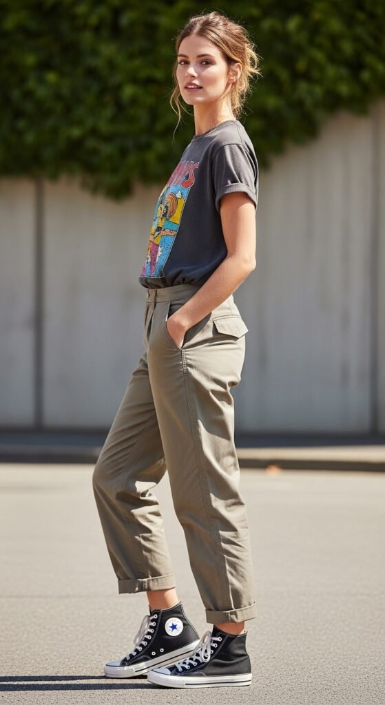 Sometimes the best outfits are the simplest ones. A vintage graphic tee tucked into parachute trousers with high-top sneakers is the casual cool uniform. This look is effortless, comfortable, and gives off major “I know what I’m doing” energy. Pick a graphic tee that shows off your personality, whether that’s a band tee, vintage logo, or quirky design. Then tuck it in to define your waist and show off those pants. High-tops add that extra streetwear edge that pulls the whole thing together. Bonus points if you add a baseball cap or beanie. This is the outfit you’ll reach for when you want to look good but don’t want to overthink it.
