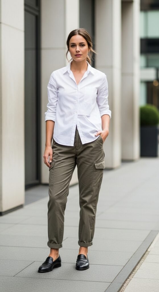 For that effortlessly chic, slightly preppy vibe, try a crisp button-up shirt with parachute trousers and loafers. This look is polished but still relaxed, which is honestly the sweet spot. You can wear the button-up tucked in for a cleaner silhouette, or leave it untucked and tie it at the waist for something more casual. Loafers add that sophisticated touch without feeling too formal. I love this outfit for brunch dates, casual Fridays, or really anytime you want to look like you have your life together (even if you definitely don’t). Go for a white or striped button-up and keep your loafers in a neutral shade like black, brown, or tan.
