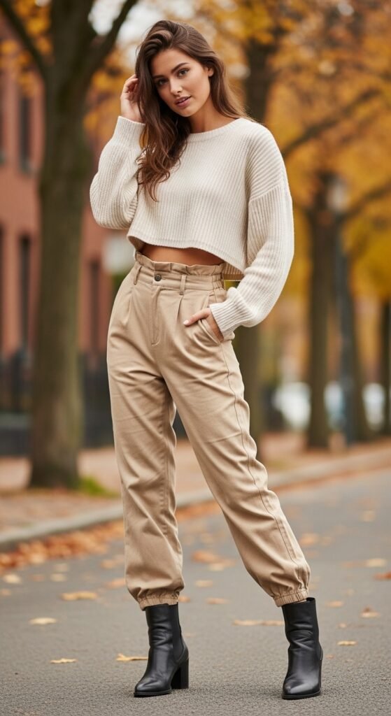 Fall outfit goals right here. A cozy crop sweater paired with high-waisted parachute trousers and ankle boots is the perfect blend of comfort and style. The crop shows off the high waist of your pants (which is flattering AF), and ankle boots add that autumn vibe we all crave. Go for a chunky knit sweater in a warm tone like rust, cream, or olive green. The texture contrast between the soft sweater and the sleek pants is everything. This is the outfit you’ll live in during October and November, trust me. Add a crossbody bag and some gold jewelry, and you’re set for pumpkin spice lattes and leaf-peeping.