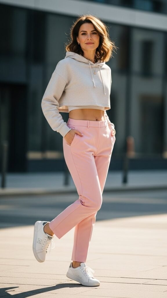 Pink trousers don’t always have to be dressed up. Pair them with a fitted hoodie or sweatshirt, add your favorite white sneakers, and embrace that athleisure hybrid energy that’s everywhere right now.