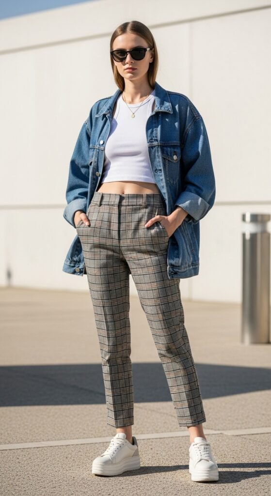 Denim on plaid sounds wild, but trust me on this one. An oversized denim jacket adds that relaxed Americana vibe to your plaid trousers, creating an unexpectedly cool street style moment.