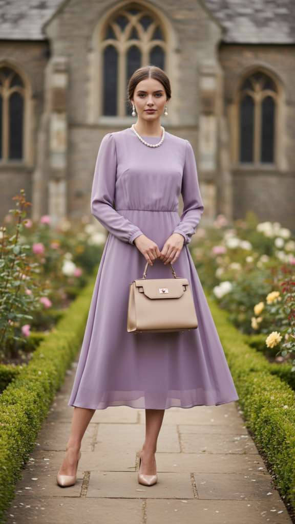 When you’re searching for a graceful yet modest church outfit, a lavender midi dress creates the perfect foundation for sophisticated Sunday styling. Choose a flowing chiffon fabric that moves beautifully while maintaining appropriate coverage for worship services.