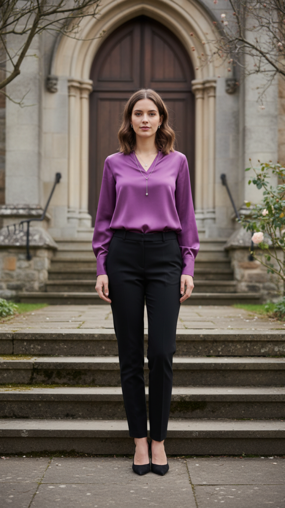 Several church-goers find that amethyst blouses paired with black trousers create a sophisticated yet approachable look for worship services. You’ll appreciate how this combination balances elegance with comfort during longer services. Choose satin blouse textures for added refinement that catches light beautifully without being distracting.