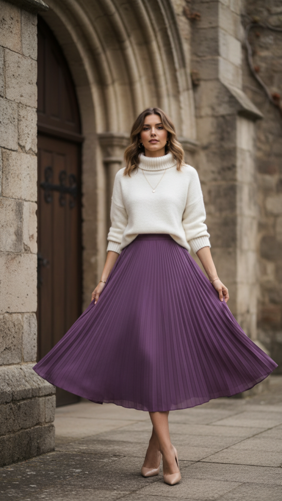 Choose flowing fabrics like chiffon or jersey knit for your grape midi skirt to create graceful movement as you walk. The rich purple hue adds depth without being too bold for church. Pair it with a cream cashmere or cotton sweater for warmth and elegance.