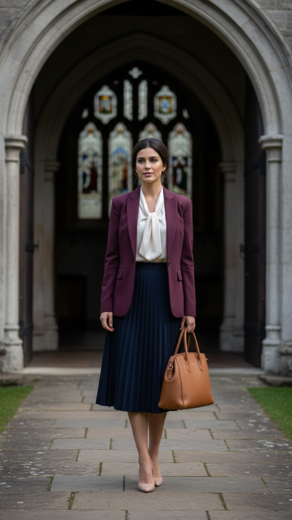 A plum blazer paired with a cream blouse and navy skirt offers a sophisticated three-piece combination that strikes the perfect balance between professional elegance and church-appropriate modesty. The customized blazer fit creates clean lines while adding rich color depth to your ensemble.