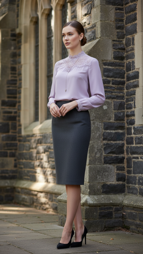 Choose a modest length that falls at or just below the knee for church-appropriate styling. The A-line cut creates a timeless shape that’s both comfortable and polished. Nude pumps complement the soft purple tone beautifully, elongating your legs without competing for attention. This combination lets you express your personal style while respecting traditional dress codes. Just like elegant black skirt ensembles, this purple dress option provides a refined foundation for sophisticated church attire.