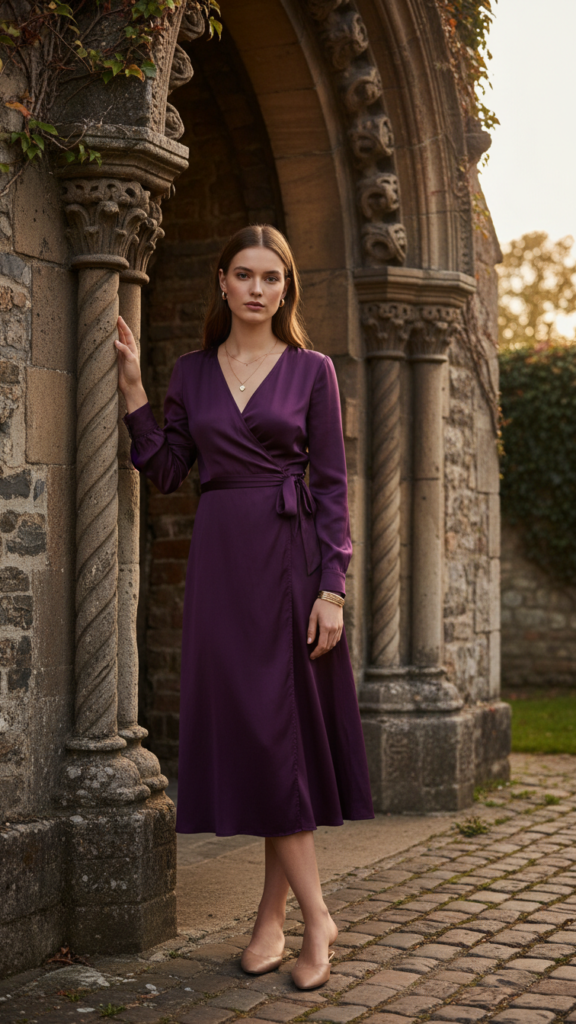 Gold metallic accents through delicate chain necklaces, stud earrings, or a simple bracelet complement purple’s rich tones beautifully. The wrap silhouette flatters various body types while ensuring comfortable movement during worship. Pair with nude or gold flats for daytime services, or low heels for evening events. For those who prefer skirts for church, a deep purple A-line skirt with a coordinating blouse offers similar elegance with the same graceful aesthetic. This combination balances elegance with practicality perfectly.