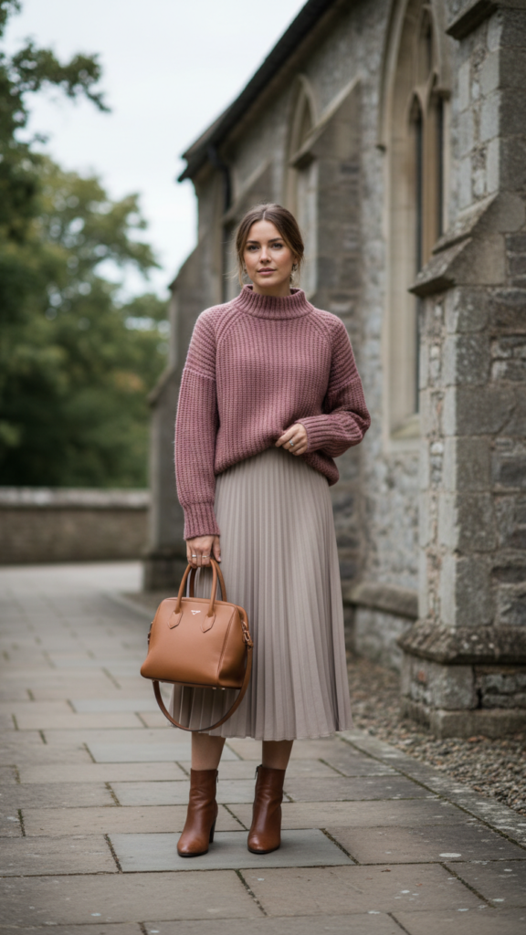 Choose A-line or pleated midi skirts in complementary neutrals like cream, beige, or soft gray. Ankle boots with moderate heels work perfectly for Sunday morning, while knee-high boots add drama for evening services.