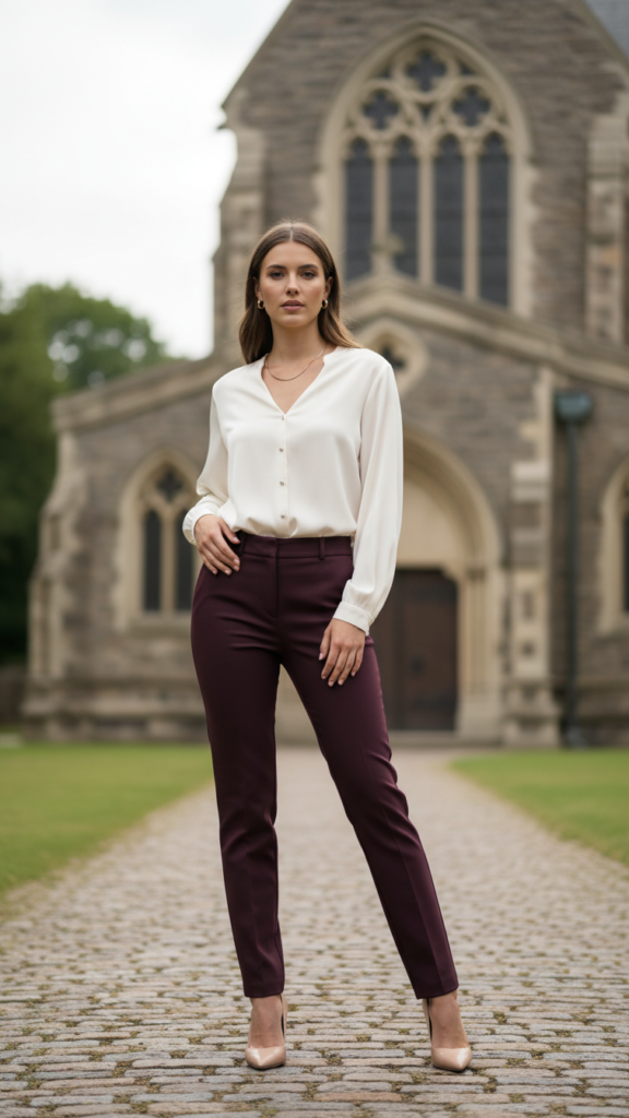 Pair your eggplant bottoms with ivory blouse styling that creates beautiful contrast. Select a cream or off-white top with subtle details like pearl buttons or delicate pleating. This eggplant color palette combination feels fresh yet timeless.