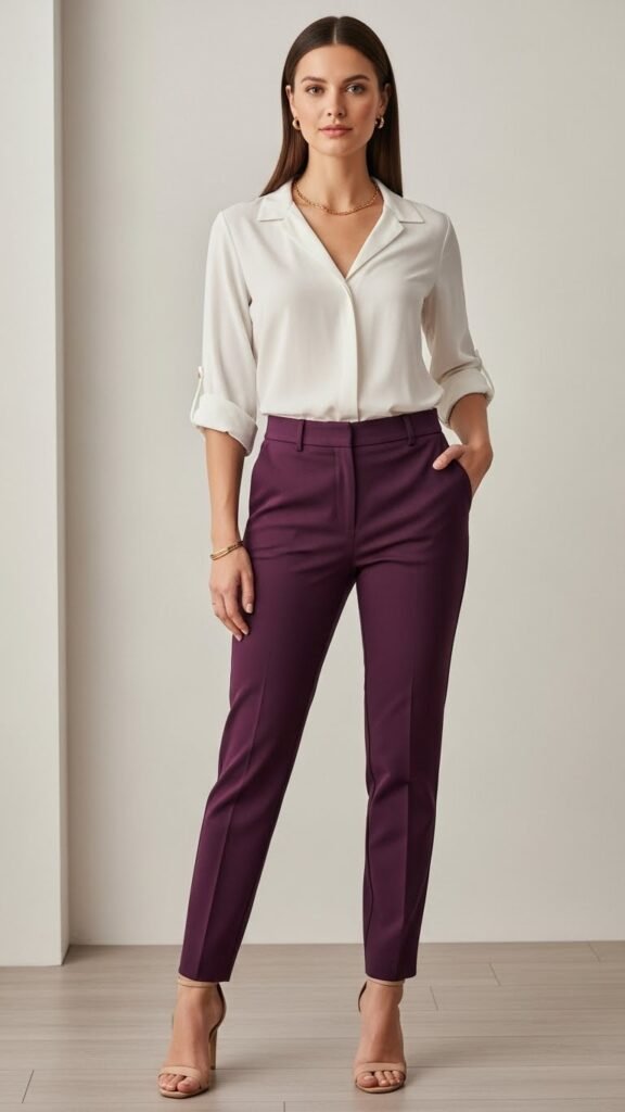 Add pointed-toe boots, whether ankle or knee-high depending on your mood. Keep accessories simple with gold studs or small hoops. This look transitions seamlessly from work to dinner to gallery opening, proving that purple trousers really can do it all.