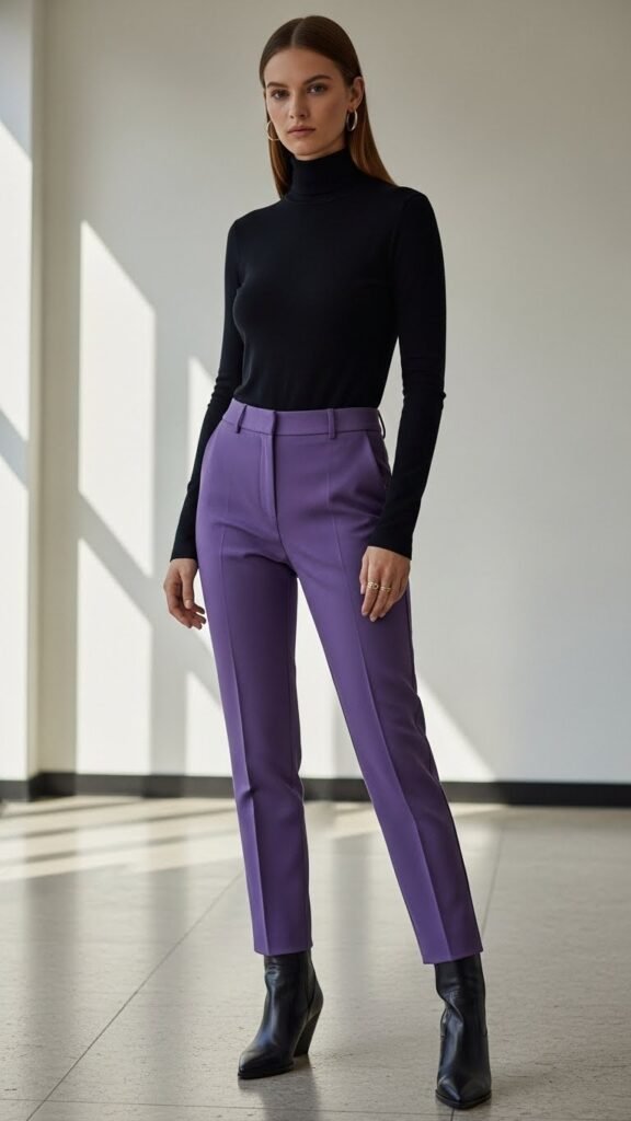 Last but definitely not least, a fitted black turtleneck with purple trousers is the outfit of someone who has excellent taste and probably reads actual books. This combo is sleek, sophisticated, and works beautifully in cooler weather.