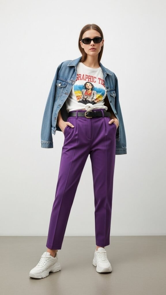 Choose a vintage band tee, a funny slogan shirt, or even a basic branded logo top. The slight irreverence of a casual tee balances out the statement trousers perfectly. It’s like saying, “Yes, I’m wearing purple pants, and no, I don’t take myself too seriously.”