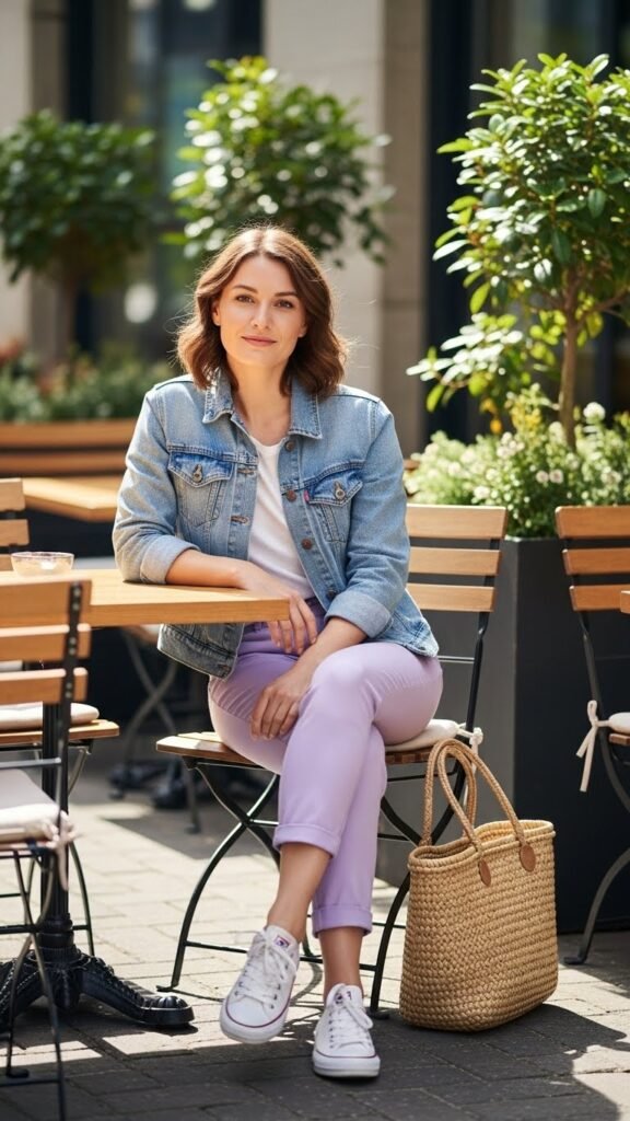 On the opposite end of the spectrum, a light wash denim jacket gives purple trousers a relaxed, approachable feel. This is the outfit for farmers markets, coffee runs, and spontaneous lunch dates.