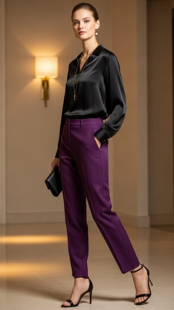 When you need to dress up those purple trousers for something fancy, a silk or satin blouse is the move. The luxe fabric elevates everything instantly, making this combo perfect for dinners, events, or anywhere you need to look like you own at least one vacation home.