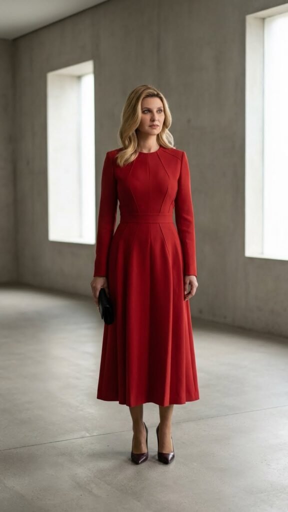 A structured red midi dress with clean lines and architectural details gives serious sophistication. Think thick straps, sharp seams, maybe a subtle geometric cutout. This is modern elegance at its finest.