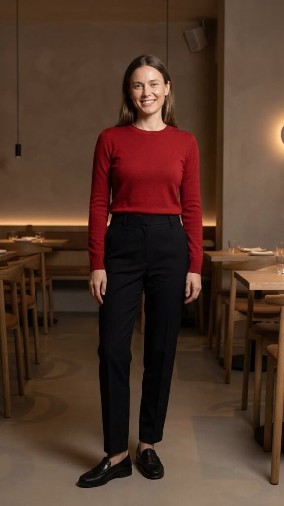 Not every dinner requires maximum glamour. Sometimes you want red without the fuss. A well-fitted red cashmere sweater tucked into tailored black trousers achieves that perfect balance of put-together and relaxed.