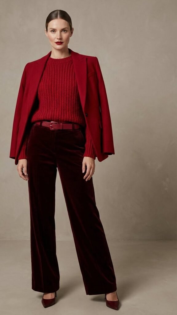 Okay, hear me out. Head to toe red. I know it sounds intense, but when done right? Absolutely stunning. The trick is playing with different textures and shades. Think a cherry red knit top with deeper burgundy wide leg pants.