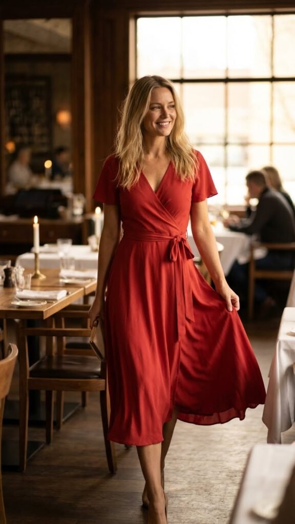 This is your go-to for date nights, anniversary dinners, or any occasion where you want to look effortlessly put together. I wore a red wrap dress to a birthday dinner once and received three compliments before I even sat down. Just saying.
