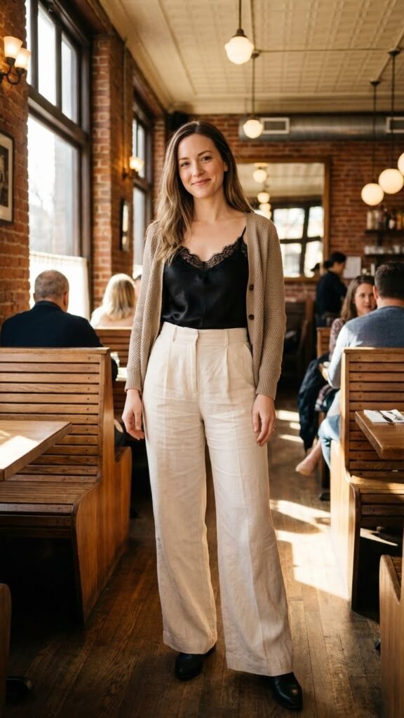 The lace adds just enough romanticism without veering into lingerie territory. Keep accessories minimal because the outfit does the talking. A sleek clutch and simple hoop earrings are all you need. I once tried adding a chunky necklace to this combo and it was way too much. Trust me on this one.